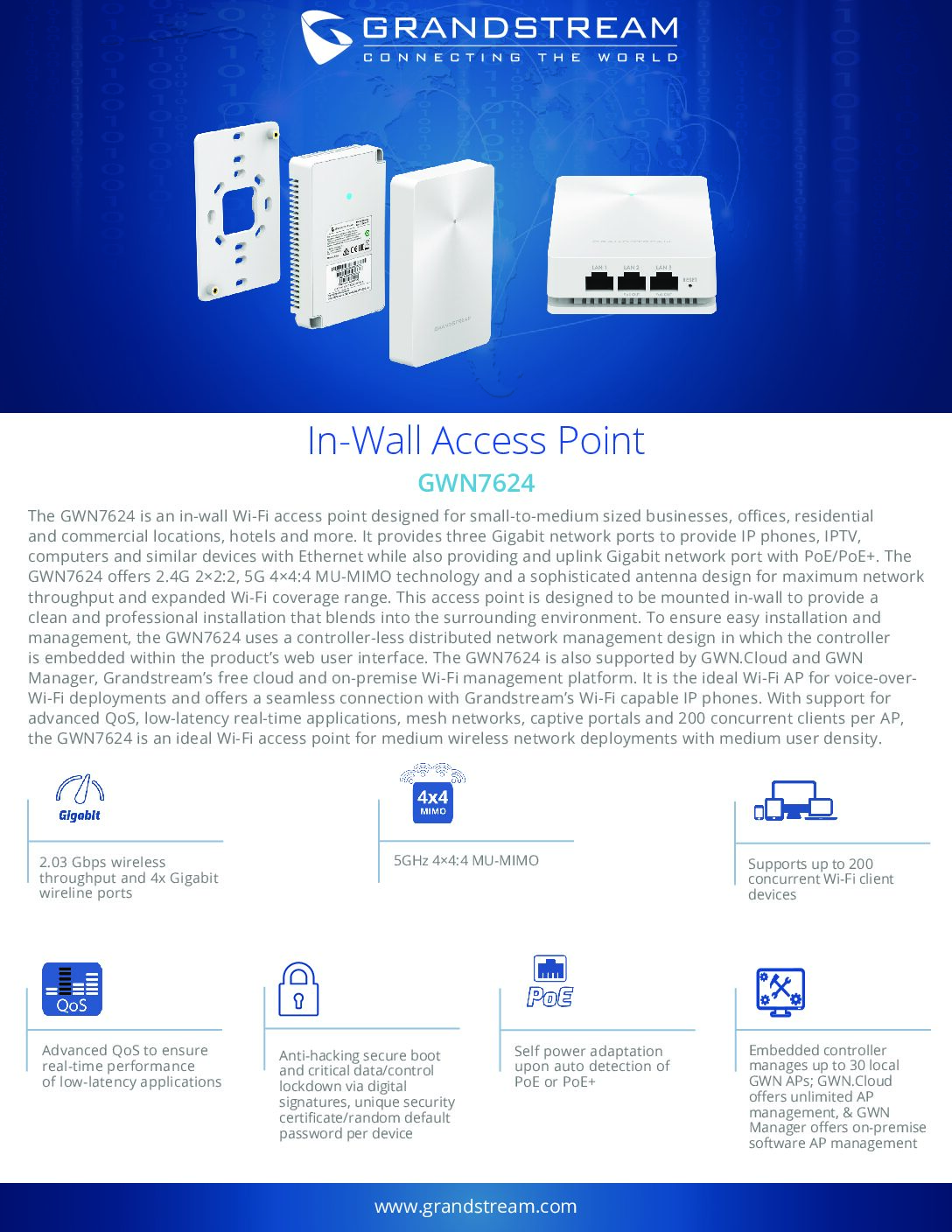 Bộ phát wifi Grandstream GWN7624 in-wall chuẩn 802.11ac 4×4:4 MU-MIMO chịu tải 200 user