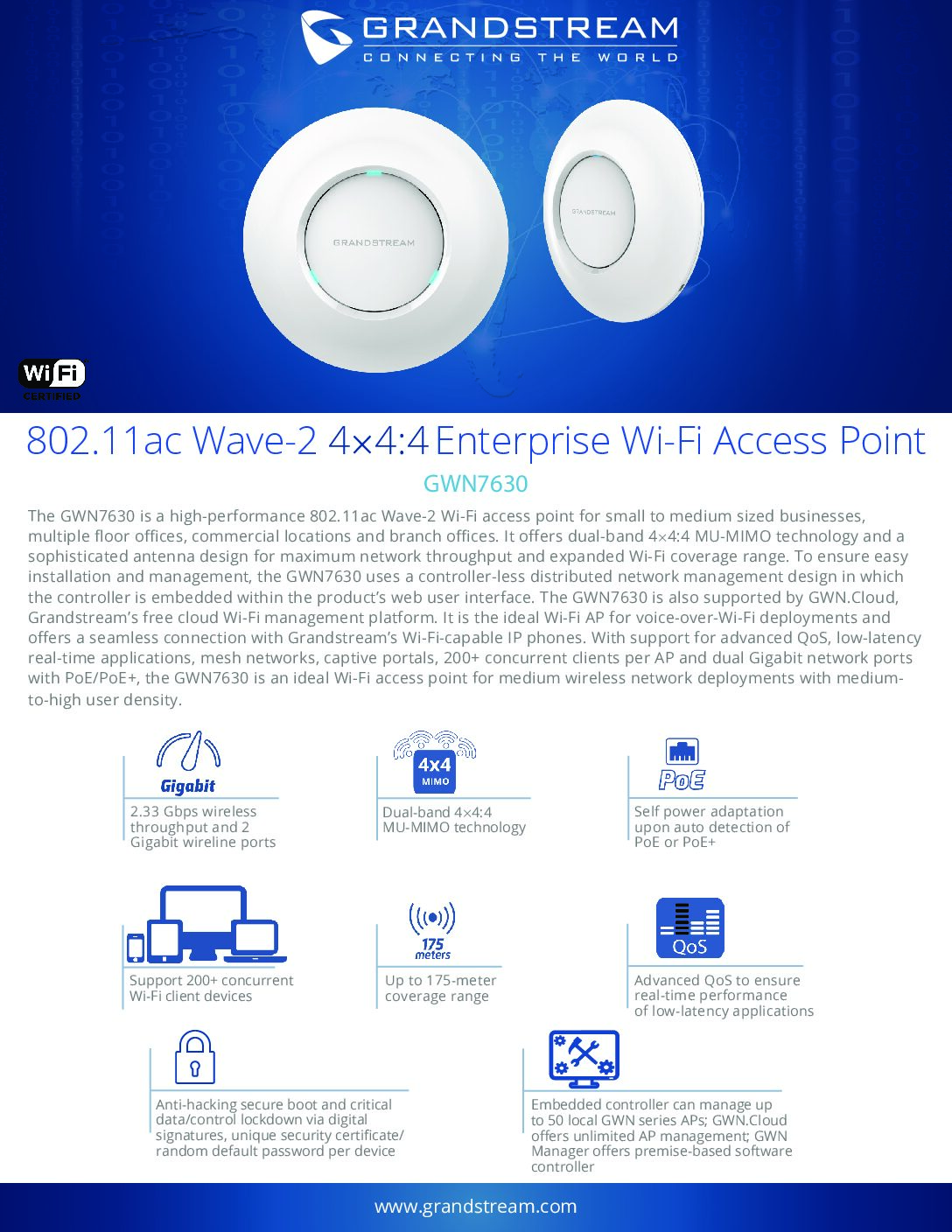 Bộ phát wifi Grandstream GWN7630 chuẩn 802.11ac Wave-2 4×4:4 MU-MIMO hỗ trợ 200 user