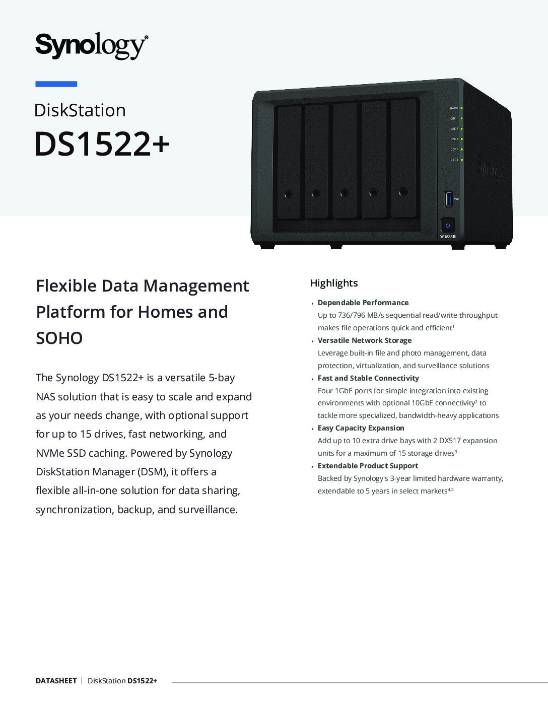 Synology DS1522+ là mẫu NAS 5 khay ổ cứng được thiết kế hướng tới người dùng đam mê công nghệ, các gia đình phổ thông và mô hình doanh nghiệp vừa – nhỏ hiện nay. 5 khay ổ cứng mặc định hỗ trợ dung lượng lưu trữ tối đa lên tới 72 TB, cho phép lưu trữ số lượng lớn các loại dữ liệu như: video, hình ảnh, file âm thanh, file văn bản, PDF, tệp tin hệ thống, bản ghi an ninh, cấu hình NAS, máy ảo… DS1522+ có thể mở rộng lên tới 15 khay ổ cứng thông qua 2 Expansion Unit DX517 khi nhu cầu lưu trữ dữ liệu của doanh nghiệp tăng lên.